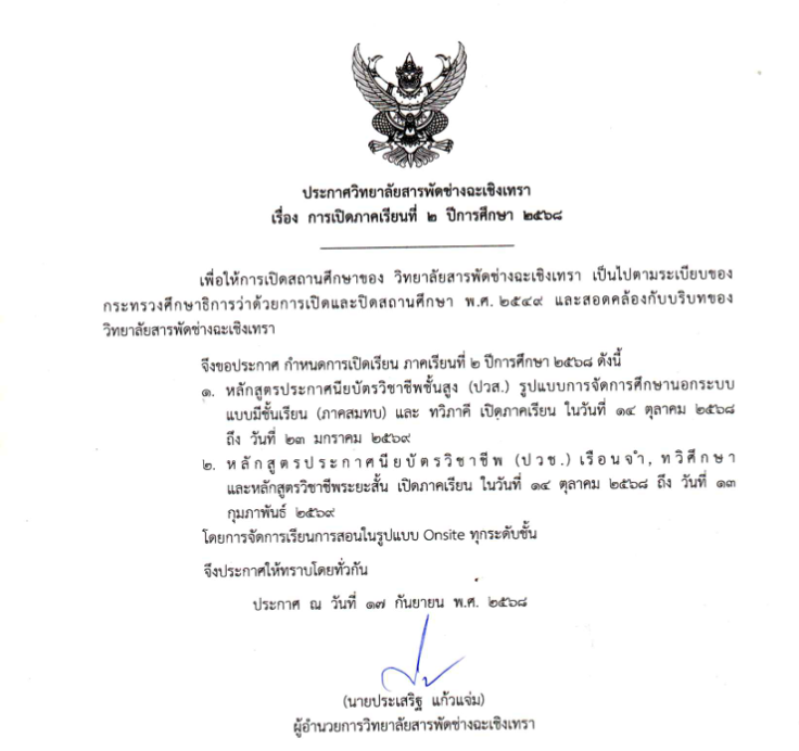 ประกาศวันเปิดภาคเรียน 2/2568 วิทยาลัยสารพัดช่างฉะเชิงเทรา